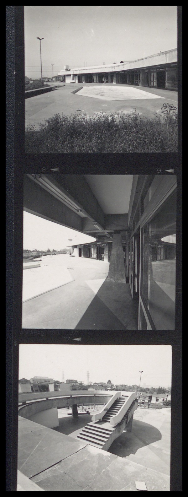 Contato de 3 imagens que mostram detalhes da fachada noroeste e o pátio do Centro Integrado de Educação Pré-Primária de Vila Alpina.