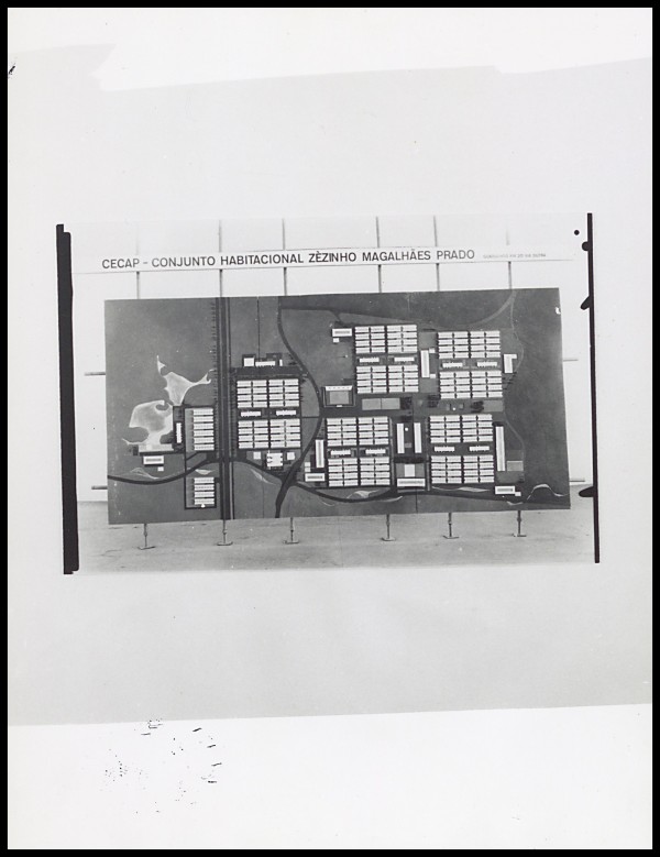 Vista geral da maquete do projeto original do Conjunto Habitacional Zézinho Magalhães Prado (CECAP Cumbica), do qual aproximadamente metade foi construída