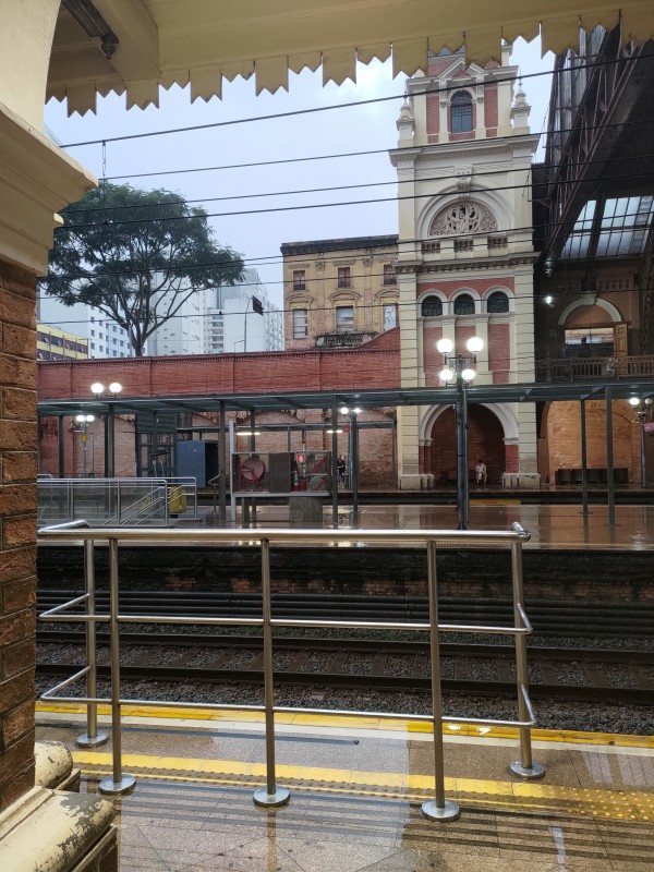 Vista a partir da plataforma de embarque da linha 11 coral da CPTM, sentido Estudantes, na Estação da Luz, em um dia chuvoso.